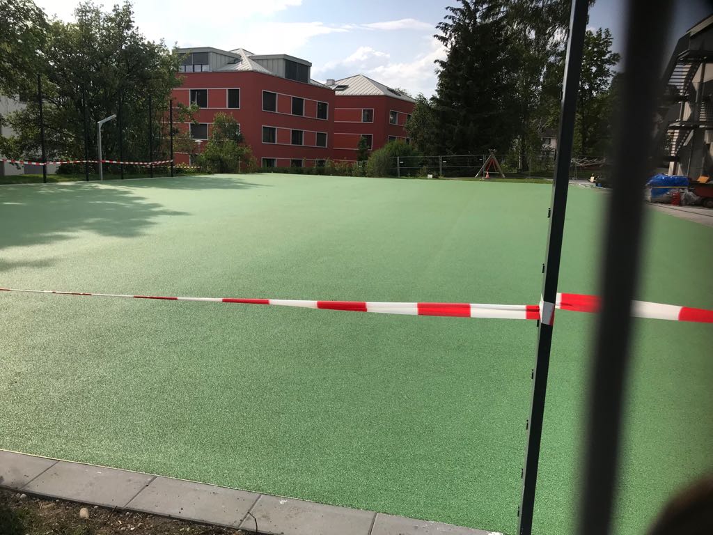 Einbau eines Kleinspielfeldes mit blauen Kunstoffbelag.